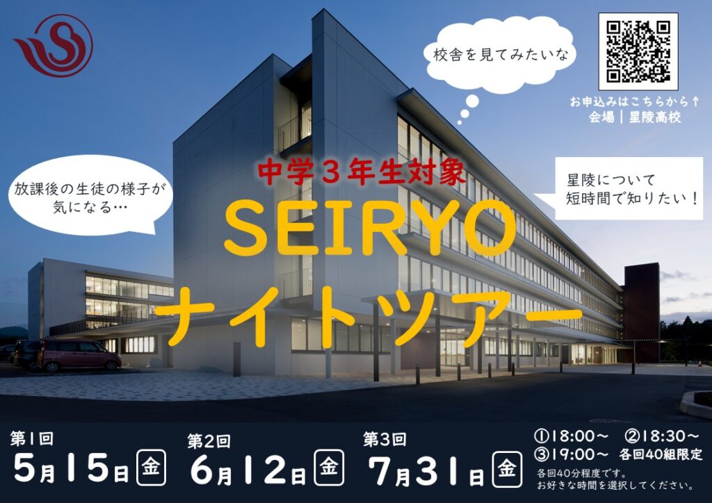 中学3年生および保護者の方を対象とした「SEIRYOナイトツアー」(夜間学校見学会)の予約が始まりました!