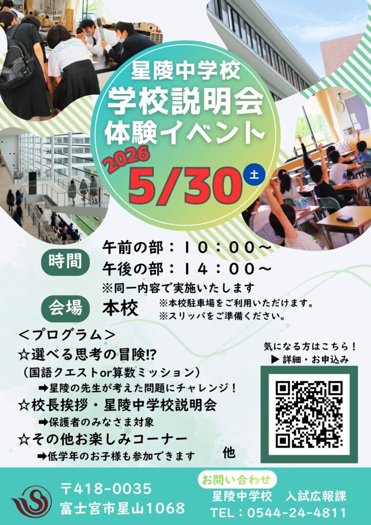 5/30(土)星陵中学校「学校説明会・体験イベント」を開催します!